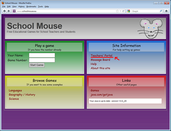 Click on 'Teacher' from the menu to go to the Teacher's Portal (or you can get there from the home page).